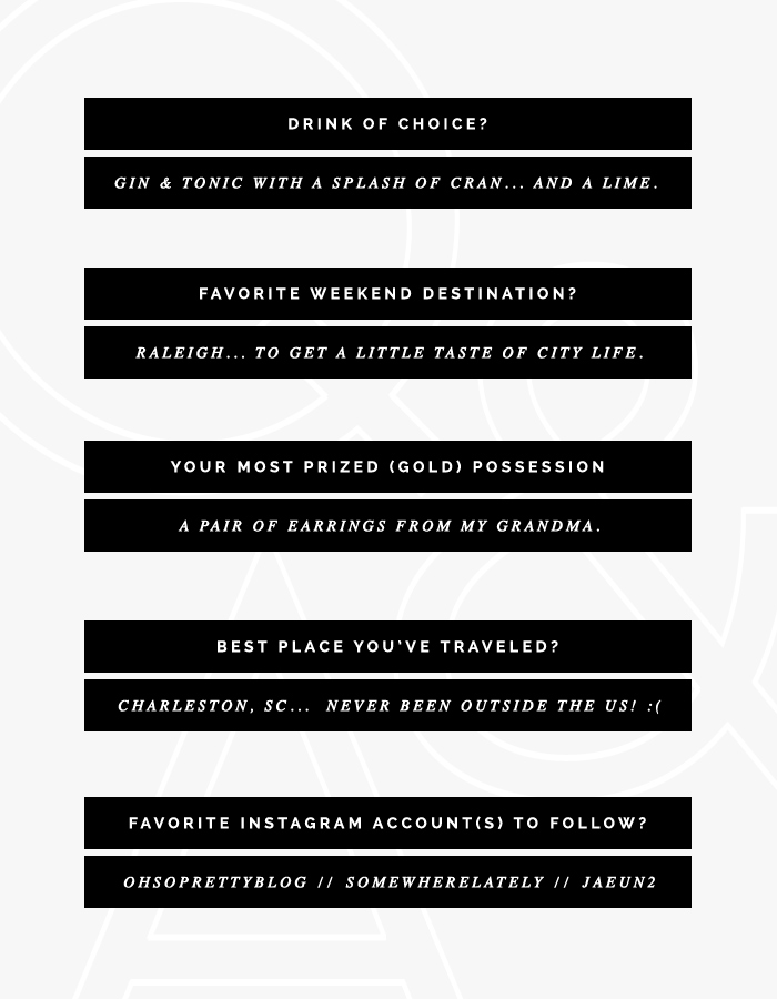 My sweet friend Brittany from The Love of Gold passed this little Q&A my way and I couldn't help but put something together. It's a fun way to learn more about each other and discover new blogs! Above are the questions she asked me and I'm inviting Gabby, Kristen, Emily and Kyla (and anyone else who feels like playing!) to answer the questions below and pass the torch along to some of your favorite bloggers.