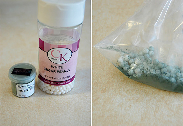 And for some extra color, I added green non-pariels. My tip for non-pariels is buying them in a plain white color and using either food coloring or luster dust to dye them the color of your choice. Just put some non-pariels in a sandwich bag, add the coloring, mix, and voila- Your own custom shade :-)